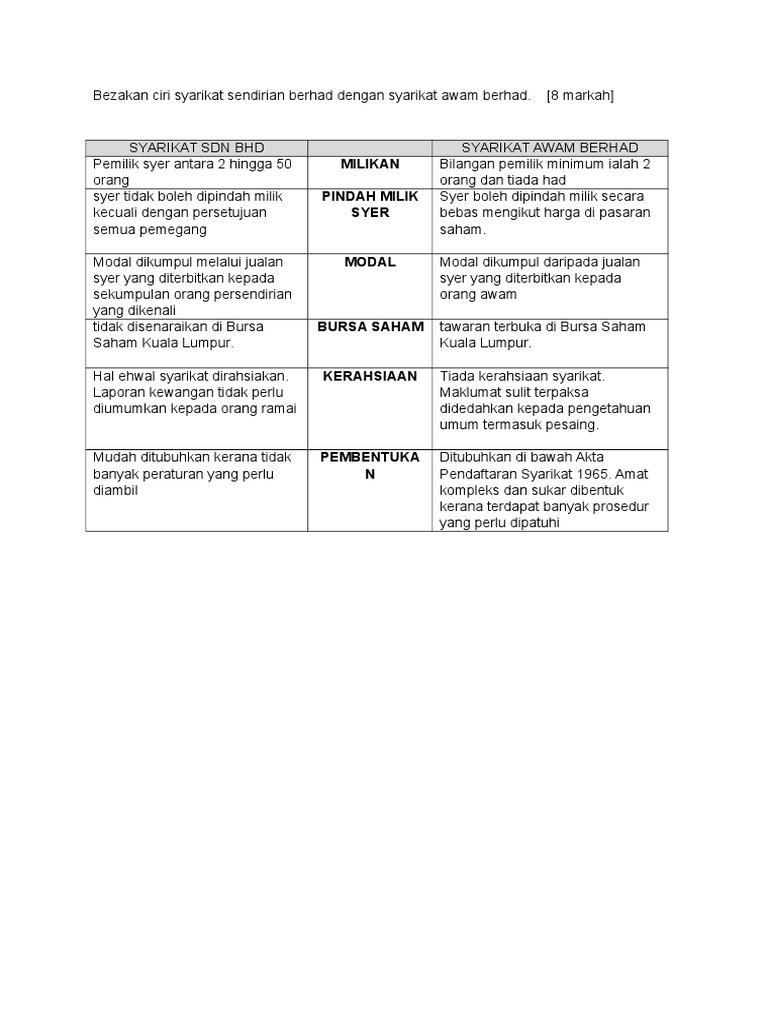 Milikan perniagaan tunggal dimiliki dan dikendalikan oleh. Syarikat persendirian atau syarikat awam 12. Syarikat enterprise atau sendirian berhad (sdn bhd)? Perbandingan antara syarikat sendirian berhad dengan syarikat awam berhad. Berpotensi untuk berkembang luas sama ada melalui penggabungan, ambil alih atau usahasama, sebaliknya pemilik saham bagi syarikat sdn.